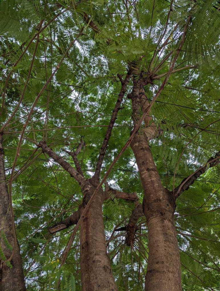 חשבתי על זה אגב השיר ״העץ יחיה״ של מוניקה סקס ועלמה גוב ובו המילים: ״העץ יחיה אחרי הכורת/ הנהר יזרום אחרי המפעל/ הפליט ישוב אחרי הרודף״ – שגרם לי לחשוב על העצים כמרחב זמן בפני עצמו שבתוכו אנחנו פסיק, לאורך כל תקופת חיינו העץ יאריך צמרתו ושורשיו בעוד כמה מטרים והם יכולים להיות קטנים כל כך לעומת גובהם של עצים שנישאים עשרות מטרים אל השמים ולמטה לתוך האדמה. כשנסעתי בפקקי הערב אתמול התחלף השיר הזה בשיר the trees של pulp שמעולם לא הכרתי. בשיר הזה, חוזר העץ שוב אך הפעם דמותו מחדדת את הכאב שחש הדובר נוכח עזיבת אהובו. העץ מייצר את החמצן שהאדם נושם, ועל גזעו אפשר לחרוט את שם האהוב שוב ושוב, אבל הוא נותר אילם נוכח כאב לב של פרידה. בשני המקרים דמותו של העץ מאפשרת לנו להביט במרחב הזמן הגדול תוך התחברות פיזית לעצמנו. נדמה לי שבגלל שכשאנחנו מביטות ביצור אחר, גם אם איננו אנושי, אנחנו תמיד רואות גם את השתקפותנו שלנו. נדמה לי שאפשר לראות את התקופה הנוכחית כשבר באמון שלנו ביחס לאנושות, ובתוך הדבר הזה אולי מקורות נחמה, חמלה ותקווה יכולים להימצא בזנים אחרים של יצורים, כמו העצים. בעצם ההתבוננות עליהם, חיים.